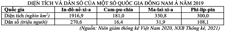 Cho bảng số liệu:Theo bảng số liệu, cho biết quốc gia nào sau đây có mật độ dân số thấp