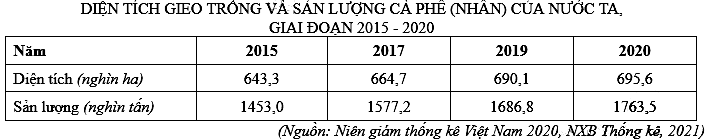 Theo bảng số liệu, để thể hiện diện tích gieo trồng và sản lượng cà phê (nhân) của nước ta, giai đoạn 2015 - 2020, dạng biểu đồ nào sau đây là thích hợp nhất?
