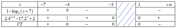 Số nghiệm của bất phương trình \(\left[ {1 - {{\log }_3}\left( {x + 7} \right)} \right].\sqrt {{{2.4}^{x + 1}} - {{17.2}^x} + 2} \ge 0\) là