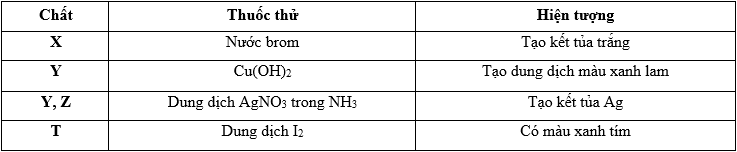 Kết quả thí nghiệm của các chất X, Y, Z, T với các thuốc thử được ghi ở bảng sau:Các chất