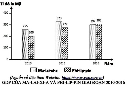 Nhận xét nào sau đây đúng GDP của Ma-lai-xi-a và Phi-lip-pin giai đoạn 2010-2016?