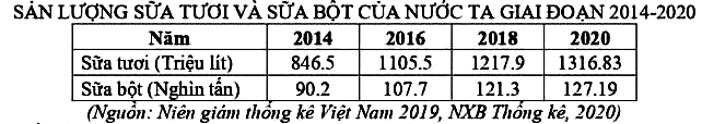 Cho bảng số liệu:Theo bảng số liệu, để thể hiện sản lượng sữa tươi và sữa bột của