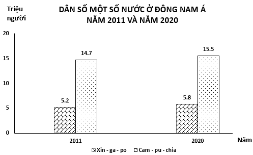 Theo biểu đồ, nhận xét nào sau đây đúng về sự thay đổi dân số năm 2020 so với năm 2011 của Xin-ga-po và Cam-pu-chia?