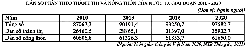 Theo bảng số liệu, để thể hiện sự thay đổi cơ cấu dân số phân theo thành thị và dân số nông thôn của nước ta giai đoạn 2010 - 2020, dạng biểu đồ nào sau đây là thích hợp nhất?