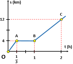 Một người đi xe đạp đã đi 4 km với tốc độ 12 km/h, sau đó người ấy dừng lại để chữa xe trong 40 phút rồi đi tiếp 8 km với tốc độ 8 km/h. Vẽ đồ thị quãng đường – thời gian biểu diễn chuyển động của người ấy.