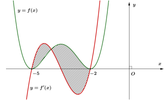 Cho hàm số \(y = f\left( x \right)\) là hàm đa thức bậc bốn, có đồ thị nhận đường thẳng \(x = - 3,5\) làm trục đối xứng. Biết diện tích hình phẳng của phần giới hạn bởi đồ thị hàm số \(y = f\left( x \right)\), \(y = f'\left( x \right)\) và hai đường thẳng \(x = - 5,\,\,x = - 2\) có giá trị là \(\dfrac{{127}}{{50}}\) (hình vẽ bên)