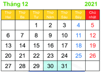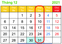 Tháng 12 năm 2021 có bao nhiêu ngày thứ