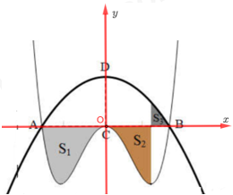 Cho đồ thị hàm số bậc bốn \(y = f\left( x \right)\) và parabol \(y = g\left( x \right)\) như hình vẽ. Biết \(A,B\) là hai giao điểm và \(C,D\) lần lượt là các điểm cực đại của đồ thị hàm số \(y = f\left( x \right)\) và \(y = g\left( x \right)\) thoả mãn \(AB = 5,CD = 2\). Gọi \({S_1};{S_2};{S_3}\) là diện tích của hình phẳng được tô đậm và \({S_1} = \dfrac{{25}}{8}\). Giá trị \(\dfrac{{{S_2}}}{{\dfrac{{10}}{3} - {S_3}}}\) bằng