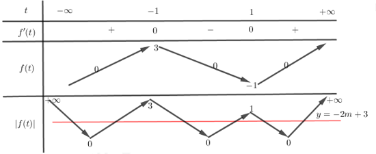 Phương trình \(\left| {f\left( {\cos x} \right)} \right| = - 2m + 3\) có 4 nghiệm thuộc khoảng \(\left[ {0;2\pi } \right]\) \( \Leftrightarrow \)Phương trình \(\left| {f\left( t \right)} \right| = - 2m + 3\) có 2 nghiệm phân biệt thuộc khoảng \(\left( { - 1,1} \right]\).
