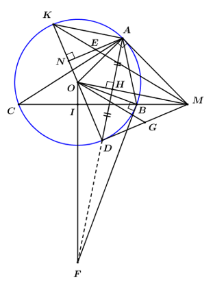 Cho tam giác \(ABC\) nhọn \(\left( {AB < AC} \right)\) nội tiếp đường tròn tâm \(O\). Tiếp tuyến tại \(A\) của \(\left( O \right)\) cắt đường thẳng BC tại \(M\). Gọi \(I\) là trung điểm của \(BC\), \(D\) là điểm đối xứng với \(A\) qua \(OM,\) giao điểm của \(AD\) và \(OM\) là \(H\).