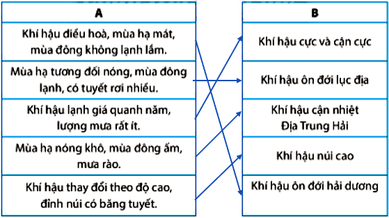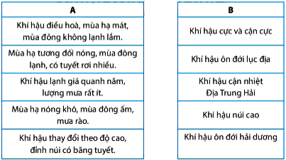 Hãy nối đặc điểm khí hậu (ở cột A) với đới hoặc kiểu khí hậu (ở cột B) cho phù hợp