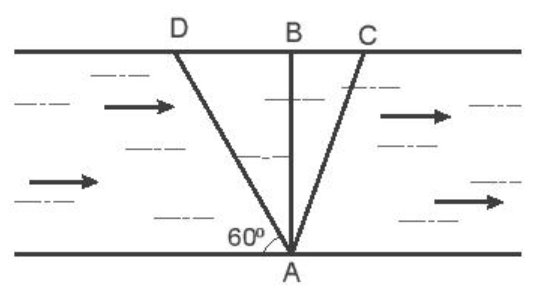 Một ca nô chạy ngang qua một dòng sông, xuất phát từ A, hướng mũi về B. Sau 100 s, ca nô cập bờ bên kia ở điểm C cách B 200 m. Nếu người lái hướng mũi ca nô theo hướng AD và vẫn giữ tốc độ máy như cũ thì ca nô sẽ cập bờ bên kia tại đúng điểm B. Tìm: