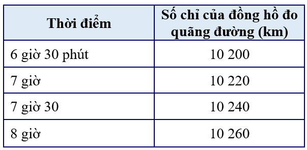 Bảng dưới đây cho biết số chỉ của đồng hồ đo quãng đường trên một xe máy tại các thời điểm khác nhau kể từ lúc xuất phát (6 giờ 30 phút).
