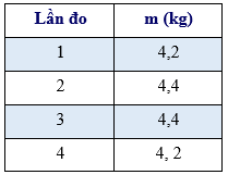 Bảng dưới đây thể hiện kết quả đo khối lượng của một túi trái cây bằng cân đồng hồ. Biết ĐCNN của cân là 0,2kg. Sai số tuyệt đối của phép đo là: