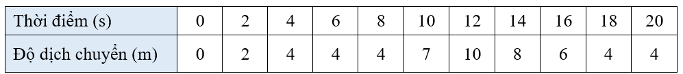 Một chiếc xe đồ chơi điều khiển từ xa đang chuyển động trên một đoạn đường thẳng có độ dịch chuyển tại các thời điểm khác nhau được cho trong bảng dưới đây.