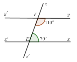 Cho đường thẳng \(zz'\) cắt hai đường thẳng song song \(xx'\) và \(yy'\) lần lượt tại \(E\) và \(F\). Biết \(\angle zEx = 70^\circ ;\angle EFy = 110^\circ \)