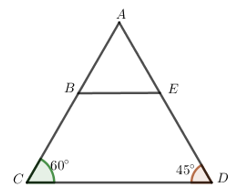 Cho \(\Delta ACD\) có \(\angle C = 60^\circ \) và \(\angle D = 45^\circ \). Kẻ \(BE//CD\left( {B \in AC;E \in AD}