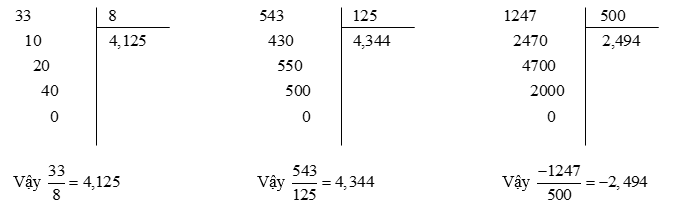 Viết mỗi số hữu tỉ sau dưới dạng số thập phân hữu hạn: \(\dfrac{{33}}{8}\); \(\dfrac{{543}}{{125}}\); \(\dfrac{{ - 1247}}{{500}}\).