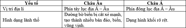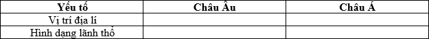 So sánh sự khác biệt về vị trí địa lí và hình dạng lãnh thổ giữa châu Âu và châu Á bằng cách hoàn thành bảng theo mẫu dưới đây.