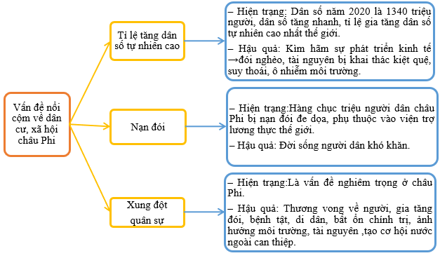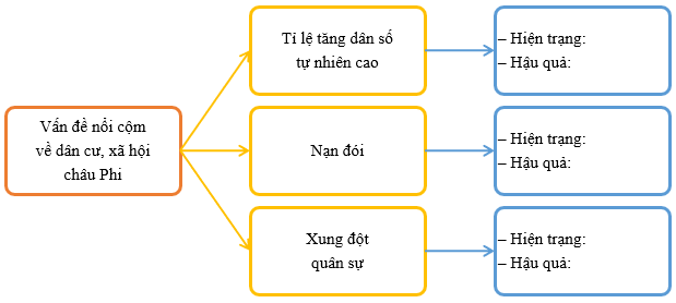 Hoàn thành sơ đồ theo mẫu sau, để thấy rõ những vấn đề nổi cộm về dân cư, xã hội ở châu Phi.