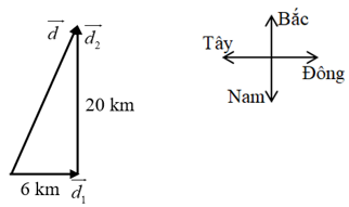 Một người đi xe máy từ nhà đến bến xe bus cách nhà 6 km về phía Đông. Đến bến xe, người đó lên xe bus đi tiếp 20 km về phía Bắc. Xác định độ dịch chuyển tổng hợp của người đó.