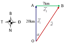 Một ô tô đi 20km theo hướng bắc và sau đó đi 7km theo hướng đông. Tìm độ dịch chuyển tổng