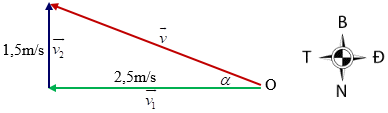 Một vận động viên bơi về phía Tây với vận tốc 2,5m/s, nước sông chảy với vận tốc 1,5m/s về phía Bắc. Tìm độ lớn và hướng vận tốc tổng hợp của vận động viên?
