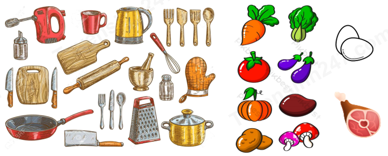 Quan sát tranh, nêu tên các dụng cụ nhà bếp và các loại thưc phẩm.