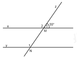 Cho hình vẽ sau, biết \(x//y\) và \(\widehat {{M_1}} = 55^\circ \). Tính \(\widehat {{N_1}}\).