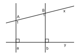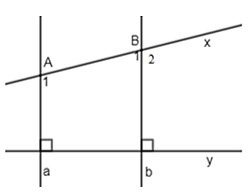 Cho hình vẽ sau. Biết \(a \bot y\), \(b \bot y\), \(\widehat {{A_1}} - \widehat {{B_1}} = 38^\circ \). Tính