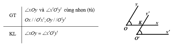 Để chứng minh \(\angle xOy = \angle x'O'y'\) ta chứng minh chúng cùng bằng một góc thứ ba.