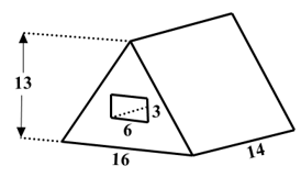 Một khối bê tông hình trụ đứng tam giác, bên trong khoét một cái lỗ có kích thước như hình vẽ (đơn vị \(dm\)). Tính thể tích của khối bê tông.