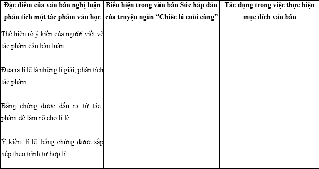 Chỉ ra những đặc điểm của văn bản nghị luận phân tích một tác phẩm văn học trong Sức hấp dẫn của truyện ngắn “Chiếc lá cuối cùng” và nêu tác dụng của các đặc điểm ấy trong việc thực hiện mục đích văn bản bằng cách hoàn thành bảng sau: