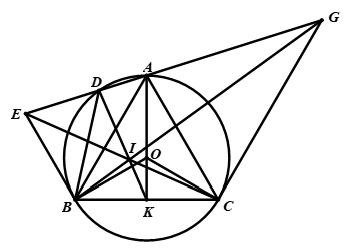 Cho tam giác đều \(ABC\) nội tiếp đường tròn \(\left( O \right)\), điểm \(D\) thuộc cung nhỏ (D khác A và B). Các tiếp tuyến ứng với đường tròn \(\left( O \right)\) tại B và C cắt AD theo thứ tự tại E và G. Gọi I là giao điểm của CE và BG.