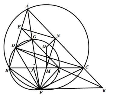2. Gọi D là điểm bất kỳ trên cạnh AB (D khác A, B). Đường tròn ngoại tiếp tam giác BPD cắt cạnh BC tại điểm I khác B; K là giao điểm của hai đường thẳng DI và AC. Chứng minh PK.PB = PC.PD