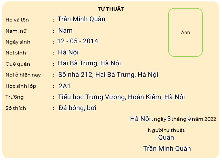 Căn cứ nội dung bài học Viết: Viết tự thuật.