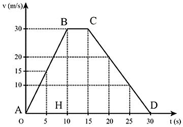Cho đồ thị vận tốc – thời gian của một người đi xe máy. Gia tốc của người đi xe mát trong 10 giây đầu tiên là: