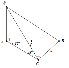 Cho hình chóp tam giác S.ABC có đáy ABC vuông tại C, BC = a, \(\angle BAC = {30^0}\). Cạnh SA vuông góc với đáy, góc giữa hai mặt phẳng (SBC) và (ABC) bằng \({45^0}\). Tính bán kính mặt cầu ngoại tiếp khối chóp S.ABC.