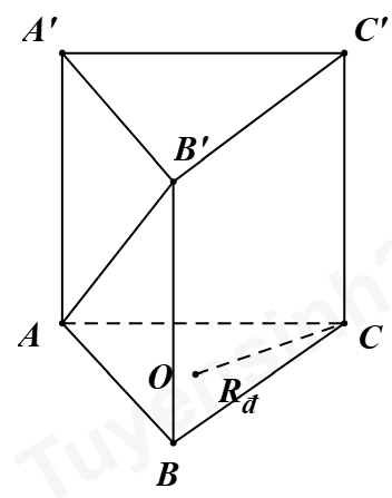 • Bán kính mặt cầu ngoại tiếp khối đa diện \(AB'C'C\) cũng bằng với bán kính mặt cầu ngoai tiếp khối lăng trụ \(ABC.A'B'C'\)