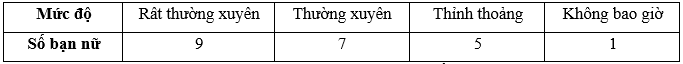 Kết quả tìm hiểu về mức độ thường xuyên sử dụng mạng xã hội của các bạn học sinh lớp 6A được cho bởi bảng thống kê sau: