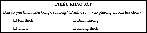 Để đánh giá mức độ yêu thích môn bóng đá của các bạn trong lớp, bạn lớp trưởng làm phiếu khảo sát như sau: