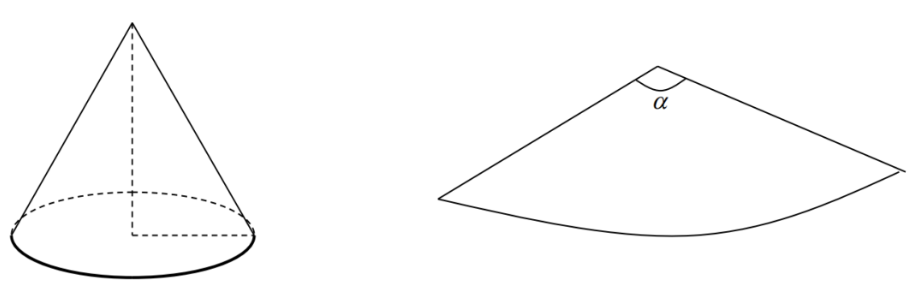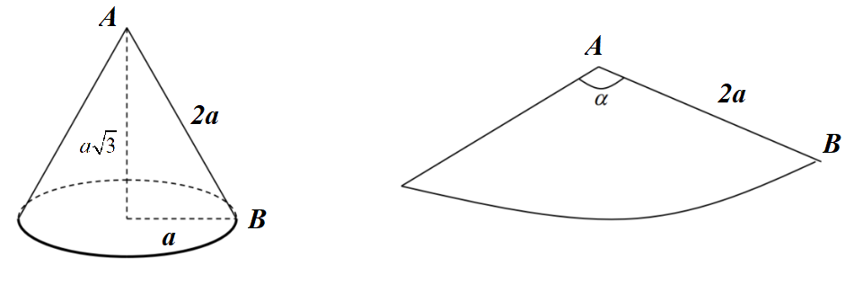 Một hình nón có đường cao \(h = a\sqrt 3 \) và bán kính mặt đáy R = a được cắt ra theo 1 đường sinh rồi trải ra mặt phẳng ta được 1 hình quạt. Tính góc ở tâm \(\alpha \):