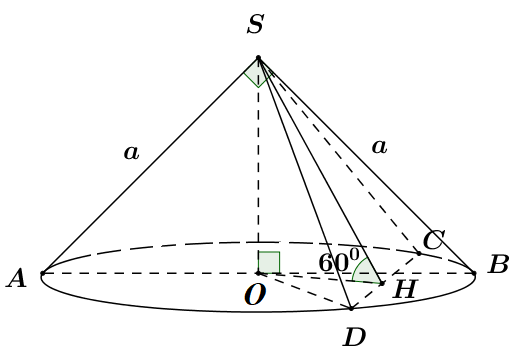 Cho hình nón có thiết diện qua trục là 1 tam giác vuông cân, đường sinh bằng a. Tính diện tích thiết diện qua đỉnh hình nón và tạo với đáy một góc \({60^0}\).