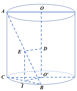 Cho hình trụ có hai đáy là hình tròn \(\left( O \right)\) và \(\left( {O'} \right)\). Trên hai đường tròn lấy hai điểm \(A,\,\,B\) sao cho góc giữa \(AB\) và mặt phẳng chứa đường tròn đáy bằng \({45^0}\) và khoảng cách đến trục \(OO'\) bằng \(\dfrac{{a\sqrt 2 }}{2}\). Biết bán kính đáy bằng \(a\), tính thể tích của khối trụ theo \(a\).