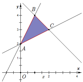 Giá trị nhỏ nhất của biểu thức \(F = y - x\) trên miền xác định bởi hệ \(\left\{ {\begin{array}{*{20}{c}}{y - 2x \le 2}\\{2y - x \ge 4}\\{x + y \le 5}\end{array}} \right.\) là