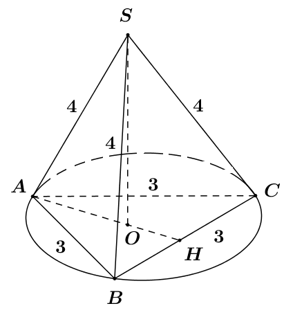Cho hình chóp S.ABC có SA = SB = SC = 4, AB = BC = CA = 3. Tính thể tích khối nón giới hạn bởi hình nón có đỉnh là S, đáy là đường tròn ngoại tiếp tam giác ABC.