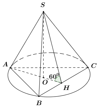 Cho hình chóp tam giác đều S.ABC có cạnh đáy bằng a, góc giữa mặt bên và mặt đáy bằng \({60^0}\). Tính diện tích xung quanh của hình nón đỉnh S, đáy là đường tròn ngoại tiếp tam giác ABC.
