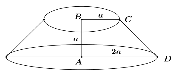Cho hình thang ABCD vuông tại A, B với \(AB = BC = \dfrac{{AD}}{2} = a\). Quay hình thang và miền trong của