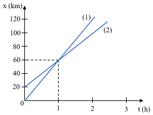 Trên một đường thẳng, tại hai điểm A và B cách nhau 20 km, có hai ô tô xuất phát cùng lúc và chuyển động cùng chiều. Ô tô xuất phát từ A có tốc độ 60 km/h và ô tô xuất phát từ B có tốc độ 40 km/h.