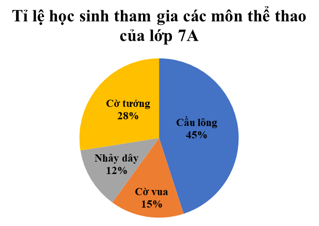 Biểu đồ hình quạt bên cho biết tỉ số phần trăm học sinh tham gia các môn thể thao của lớp 7A. Biết rằng lớp 7A có 40 học sinh, hỏi có bao nhiêu bạn tham gia môn Cầu lông?